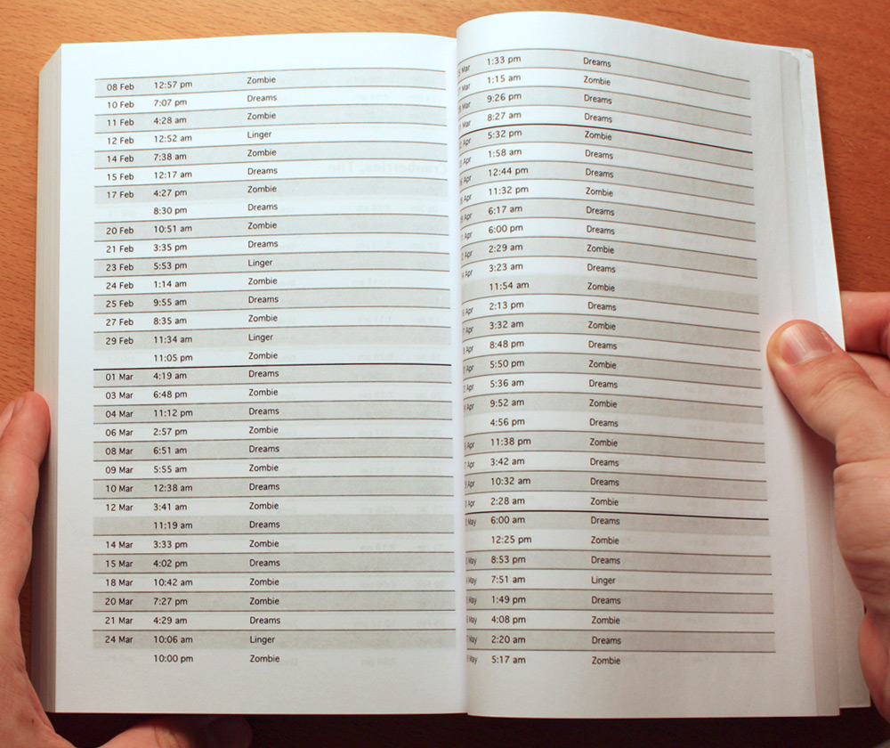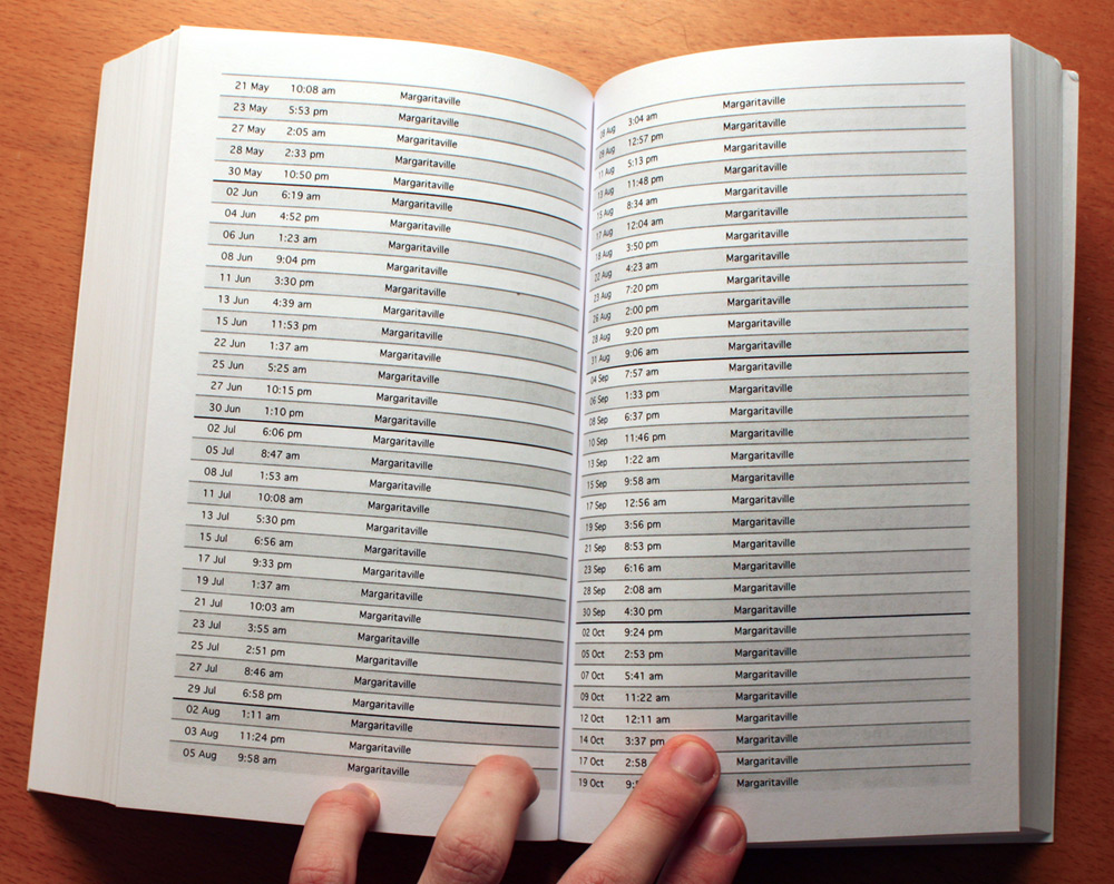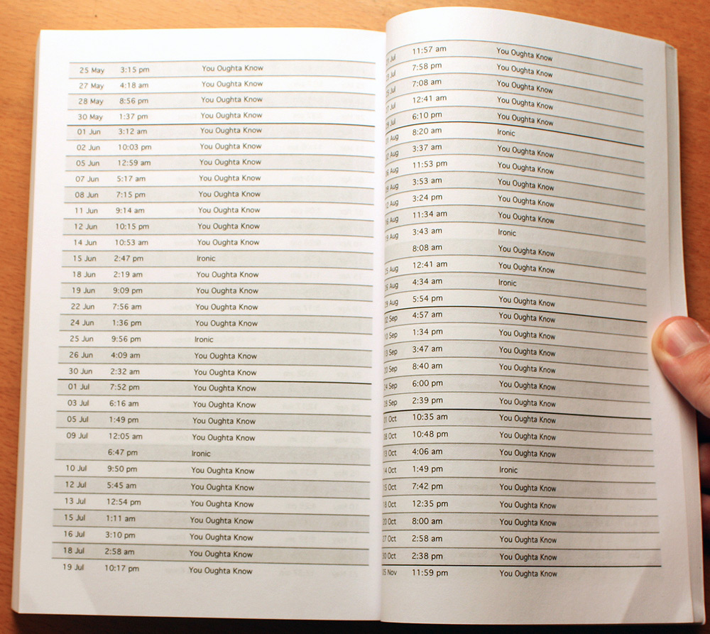 Thumbing through the pages, you might ponder the creative decisions made or not made, the often machine-perfect regularity of intervals between songs in rotation, or songs introduced or retired halfway through the year. How much of this pattern is algorithmic and how much is human? You might begin to read the juxtaposed song titles as poetry .