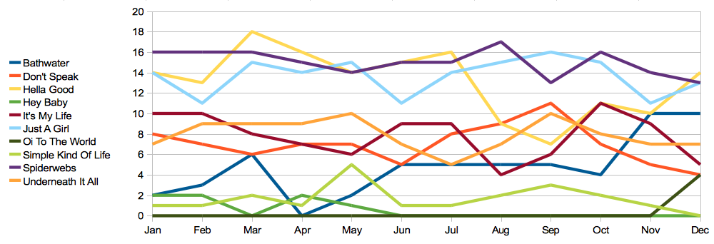 At the end of 2008, I wrote a simple website-scraping script which downloaded the date, time, artist and title of every track played on 93.1 JACK FM in Los Angeles that year...